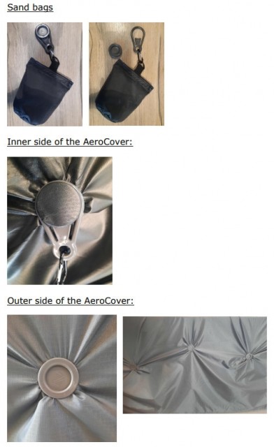 De 4 vektposene kan fylles med sand, lukkes ved hjelp av borrelåsene og festes på trekket (innsiden) med de inkluderte festeklipsene i plast som følger med.