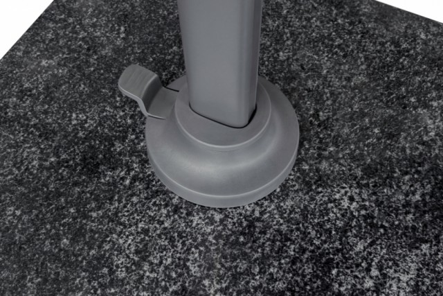 Parasollen leveres uten parasollfot. Vi anbefaler en parasollfot på minimum 90 kg. Spesielt anbefaler vi modellen Acona 90kg (varenr. 6222) som også har avrundede kanter og matcher parasollen perfekt. Disse parasollføttene er utstyrt med svingbare hjul slik at parasollen er lett å flytte.